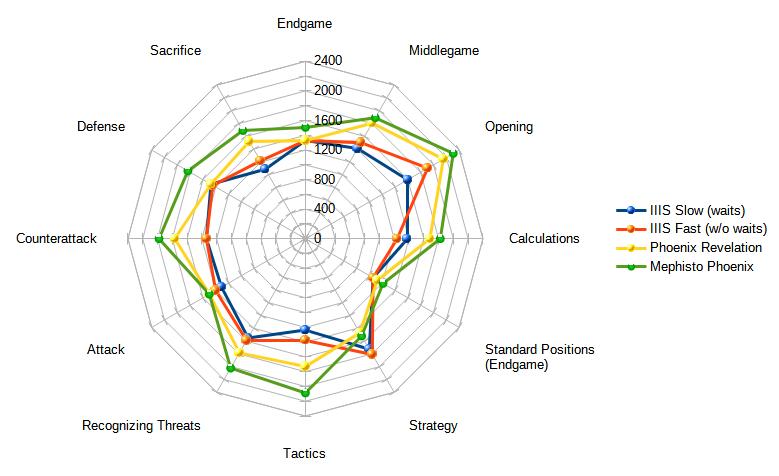 Another small oddity lies in the calculations, where the fast IIIS performs less then the slow one; but otherwise the calculations scores look to range accordingly to expectations. The fast IIIS must have been on a wrong track with some position, there is of course some alea related to the current score at the time the thinking process is stopped.