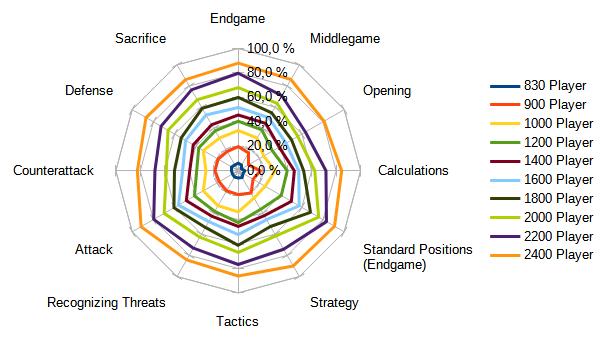 - skills develop rather evenly from 830 to 900 player (very same shape), with natural ability for calculations and no, to very little, knowledge about opening phase. Of course, standard endgame positions are likely to be unknown.