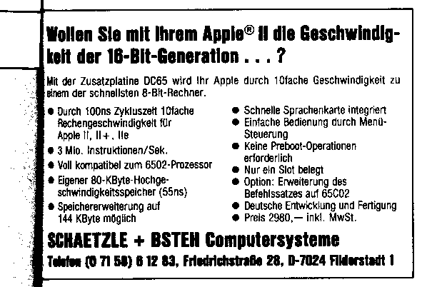 Im gleichen Jahr war dann der „DC65" serienreif, eine Steckkarte für Applecomputer mit einem voll kompatiblen Hardwareprozessor mit 12,5 MHz.