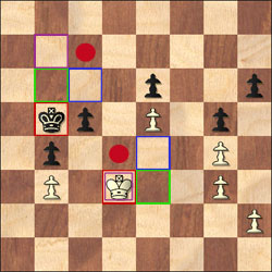 Wenn Schwarz nun auf c7 steht, kann er ebenfalls diese beiden Felder erreichen, das entsprechende Feld für Weiß, was dies leisten würde wäre d4 (rote Kringel - f4 wär' wieder zu weit weg und ist ohnehin tabu). Dieses ist ihm aber verwehrt, was den Gewinnweg für Schwarz klar macht.
