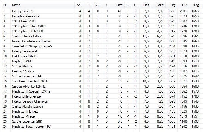 Somit ist Runde 4 beendet. Platz 1 mit 4 aus 4 der Super 9, dahinter - etwas überraschend - Alexandra, gefolgt von der CXG Armada. Noch ohne Sieg am Tabellenende der Superstar 28K und der kleine Mephisto TSTC. Den Little Chesster hatte ich stärker eingeschätzt, da es ein abgespeckter Excellence sein soll. Die Bedienung ist identisch, nur dem Programm merkt man nichts mehr von der Spielstärke des Excellence an.