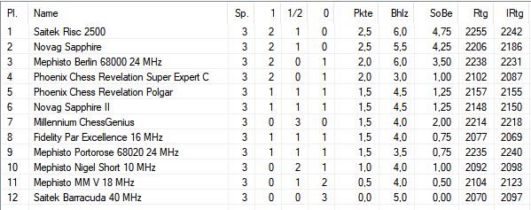 das letzte Spiel aus Runde 3 zwischen Polgar und Sapphire ist beendet und war in mehrerlei Hinsicht bemerkenswert. Zum einen war der Sapphire bis zum 20. Zug im Buch, verlor aber danach einen Bauern und später noch die Qualität. Im Gegenzug räuberte er Bauern und nachdem der Polgar leichtfertig den letzten Turm zum Tausch anbot war es eigentlich Remis. Beide zeigten auch länger 0,00 in der Bewertung an und wir wollten nur warten, bis der letzte weisse Bauer fällt - wir sahen also noch geringe Siegchancen beim Polgar. Dann warf dieser aber plötzlich das sichere Remis weg und versuchte wohl noch den Bauern durchzubringen, maneuvrierte sich dabei aber in ein Matt durch die generischen Bauern. Unglaublich, daß dies in dieser Klasse passieren kann...