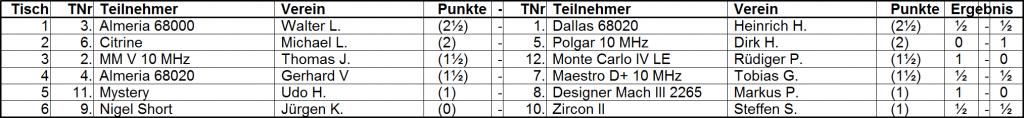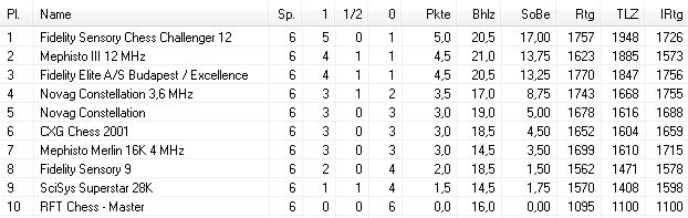 Auch ich habe nun die Ergebnisse und Partien der A-Gruppe in diese Datenbenk eingepflegt. Mir fehlen aber noch folgende drei Partien: Runde 3: Mephisto Mystery vs. Mephisto Nigel Short Runde 4: Mephisto Nigel Short vs. Novag Zircon II Runde 5: Mephisto Almeria 68020 vs. Mephisto Mystery Gruß, Rüdiger Ach so: die blaue Schrift ist der Link zur Seite! Also gleich mal drauf klicken! ![]()