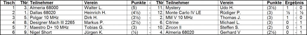 wie schon von Rüdiger angesprochen gab es in Klingenberg dieses Mal 2 Gruppen. Ich habe in Gruppe B mitgepielt, dort wurde die WM von 1983 in Budapest nachgespielt. Gleich zu Beginn fiel der Sensory 9 B mit 2 MHz und Budapest Programm aus und musste durch den schwächeren Sensory 9 mit 1,6 MHz ersetzt werden. In Runde 2 versagte dann leider auch ein Reed vom Elite A/S Budapest und wir konnten ihn mangels Zeit nicht reparieren - er wurde durch den etwas stärkeren Excellence ersetzt. Zum Ausgleich lief dieser nur mit 15 Sek/Zug. Nachfolgend die Ergebnisse in der Kreuztabelle und die Abschlusstabelle. Wenn die PGNs vorliegen wird zum Turnier wieder ein Wiki erstellt. Gruß Achim |