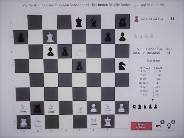 Wenn ich schon einmal dabei bin, hier noch eine etwas sehr seltsame Partie, gespielt bei Zeit Online, wo man auch Schach spielen kann. Ich hatte denen schon einmal geschrieben, das deren Schachprogramm etwas kaputt ist, aber wie man sieht, gibt es keine Verbesserung