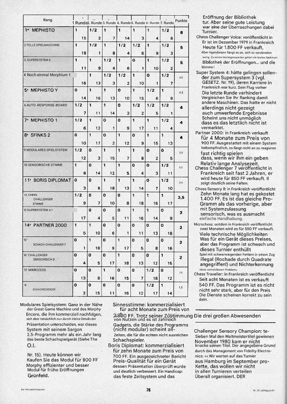 Schade, meine Französischkenntnisse tendieren quasi gegen Null. Auch wenn ich vor einigen Jahrzehnten einige Wochen in Frankreich war. Außer Cafe au lait und Merci fällt mir nichts ein. Mehr braucht man ja auch nicht, außer beim Schach. ![]() Interessant wären ja die Programmeigenschaften gegenüber dem Original Mephisto 1 und dem Mephisto 2. In der Tabelle ist ersichtlich, das der Mephisto kein Spiel verloren hatte, und 2 Remise. Seinerzeit ziemlich beachtlich. ![]() |