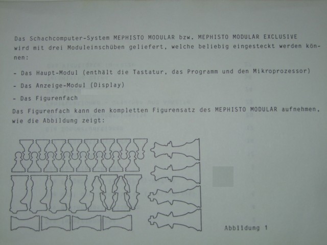 Nun habe ich vor kurzen einen Mephisto Modular erworben zusammen mit einem Figurensatz, der in das Leermodul paßt. Zu meinem Erstaunen ist in dem Leermodul auch ein Metallsteg eingebaut, damit die Magnetfiguren festen Halt haben. Das ganze sieht original und nicht umgebastelt aus. Ich war bislang davon ausgegangen, daß es nur einen (größeren) Figurensatz für den Modular gab. Ich habe Bilder davon in die Wiki eingestellt (unter Modular) Roland Hallo Roland, es gibt einen großen Figurensatz mit 60mm Königshöhe und einen kleineren Figurensatz mit 53 mm Königshöhe. Der kleinere Figurensatz mit KH 53mm paßt auch komplett in dieses Leermodul mit dem Aluminiumsteg. Hier ein Ausschnitt aus der dazugehörigen Original BDA: . Viele Grüße Olaf - Chaturanga - _____________________________________________ Homepage: www.chaturanga.info |