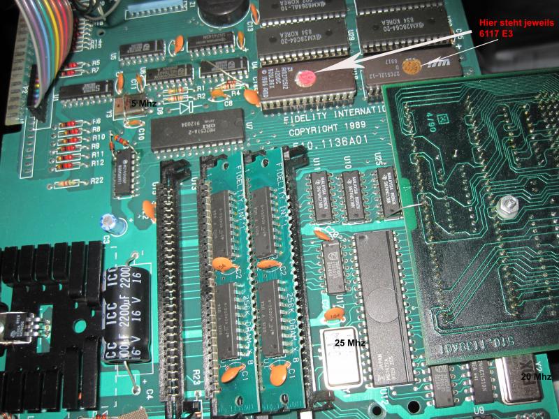 Wie es aussieht nehmen die Überraschungen kein Ende... Ich wollte ein paar Fotos für Herrn Bucke machen - aber als ich schon die Abdeckung weggenommen hatte wußte ich, dass es auch keine V3 ist! Es leuchtete ein Motorola 68020 mir entgegen. Also liege ich wohl jetzt bei einer V6? Ich habe mal ein paar Fotos angehängt. Was ich nicht verstehe - ich finde drei Quarze. Einmal 4,9152 (5Mhz) und einmal 20 Mhz und einmal 25Mhz? Ich habe auf dem Foto alles gekennzeichnet. Es sind tatsächlich zweimal 256 DRAM enthalten. Auf den 2 Eproms steht "6117 03" und "6117 E3"... Konnte man eine V2 so einfach zu einer V6? umrüsten? Und vor allem macht es überhaupt Sinn? Dann hätte ich doch gleich auf eine ganz andere Version umgerüstet... Oder es wurde damals nur das Gehäuse getauscht?! Das reicht für heute an Überraschungen... Fragende Grüße José |