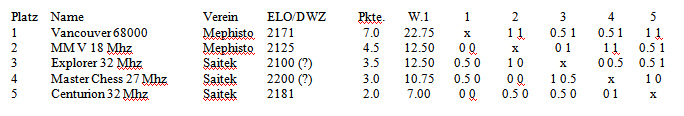 Der am schwächsten eingestufte Explorer hielt erstaunlich gut mit und landete vor den großen Brüdern, für mich eine Überraschung (natürlich nicht representativ). Der stärkste Compi (von der AL-ELO her) landete am Ende