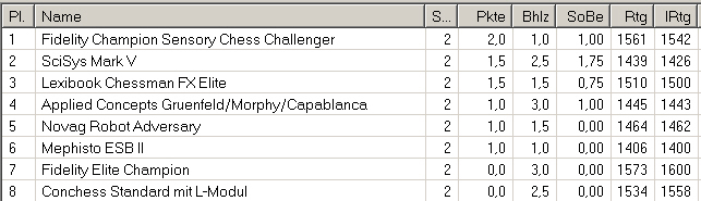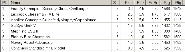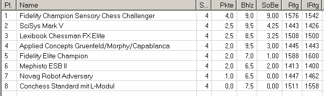 Hier nun die Ergebnisse der 4. Runde: ![]() Versehentlich wurden beim Spiel Nigel Short vs. Mondial 68000xl von den Spielern die Farben vertauscht, so dass der Mondial 68000xl mit den weißen und der Nigel Short mit den schwarzen Figuren spielte. Dieser Fehler wurde erst bei der Abgabe des Ergebnisses bemerkt, als keine Zeit für eine Wiederholung mehr zur Verfügung stand. Beide Parteien akzeptierten das so. Und die Auslosung der Runde 5: ![]() sowie der Zwischenstand nach 4 Runden: ![]()