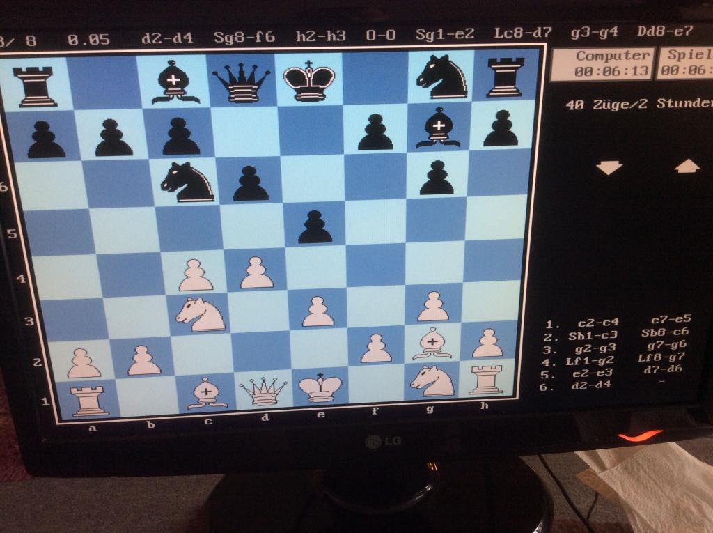 Ob es reicht ?? Der The King 2.54 aggressiv war da bislang sozusagen durchmarschiert . Und mit schwarz ? Na wir schauen mal. Wird nicht einfach für den ava. Nachdem mein Compaq PC , also so ein schnuckeliges mobiles Teil, aufgegeben hatte, musste ich doch tatsächlich meinen alten Amd PC aus dem Keller wieder aktivieren. Ein amd k6-2 mit 500 MHz der immerhin noch 2 ist slots hat. Auch den amd k6-3 habe ich noch. Saubergemacht. Angeschlossen. Läuft !! Das ist Technik !!! Die Chessmachine sieht auf nem 24 Zoll Flachbildschirm sagenhaft aus.