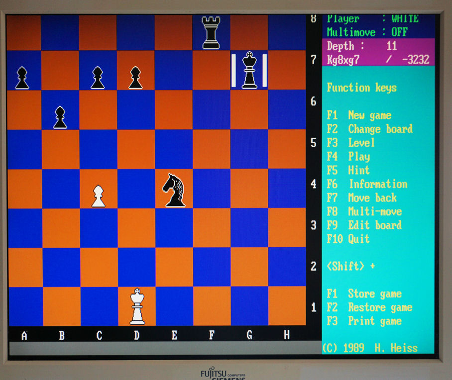 Das wollte ich wissen und ließ mal den Novag Super Forte A auf den PC-Oldie los. Wobei "Oldie" für das Programm (1989) gilt. Der PC hat ein Herstelldatum von 2008 und wird u.a. mit Windows 98 betrieben.