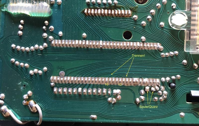 Für den Umbau müssen 2 Leitungen auf der Platine sauber durchgetrennt werden (Vorsicht! Kurzschlussgefahr!) und mit Kabel umverbunden werden.