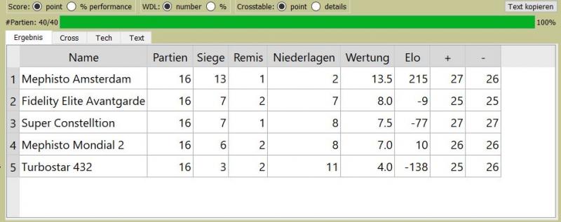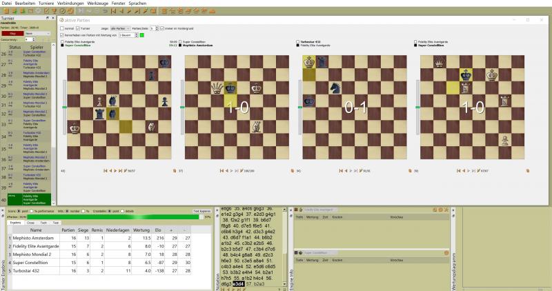 Ein Turnier zu organisieren mit dieser GUI macht schon Spaß. Egal ob 2 Teilnehmer oder mehr, zeitlich geht das sehr schnell. Hier jetzt alle Emulatoren auf Level 2 und Max Speed. Ist jetzt in der GUI einstellbar. 4 Runden jeder gegen jeden insgesamt 40 Partien. Hatte jetzt keine Stoppuhr , aber ich glaube nach zirka 30 Minuten war alles vorbei. Später habe ich das Turnier wiederholt . Diesmal 6 Partien gleichzeitig, es lief alles stabil. Natürlich sollte man genügend Kerne haben. Wem das alles zu schnell geht , kann die Partien in Ruhe nachspielen. Das Ergebnis möchte ich euch nicht vorenthalten. Übrigens ist es übersichtlicher wenn die Engines in die Taskleiste rutschen , wie vor ein paar Tagen hier im Forum besprochen. Sonst wird man mit Fenstern zugeballert ![]() @echo off cd.. start /B /WAIT /MIN MessChess.exe %1 %2 %3 %4 %5 %6 %7 %8 %9 cd Arena Hier noch mal der entsprechende Code für die mess.cmd Danke noch mal an Tibono und Franz. Mark 1 |