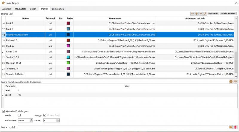 Also ich bin jetzt nicht der grosse Erklärbar aber ich versuche es mal . Sry aber in Deutsch , meine Englisch Kenntnisse sind mies ![]() aber eigentlich ist es sehr einfach. Bild 1: Beispiel Mephisto Amsterdam. Was wir wissen müssen ist , die Befehlszeile (Arena Pfad mess.cmd) und Kommandozeilen Parameter Bild 2: Dann unter Banksia in die Einstellungen gehen . Dort Plus Zeichen drücken für neue Engine. Bild 3: -Protokoll uci -Unter Engine Datei ihre Arena Pfad mess.cmd eingeben -Name "Mephisto Amsterdam" kann auch anders benannt werden -Init strings "amsterd" auf ok Drücken Banksia sollte nun Mephisto Amsterdam erkennen Bild 4: Unter Parameter können sie nun Level Und Speed eingeben Noch ein Nachtrag wegen uci , wähle ich wb kann ich keine Parameter einstellen. Das aber nur kurz an getestet . Unterschied zwischen wb und uci kann Franz bestimmt mehr sagen. Ich hoffe einigermaßen geholfen zu haben. Mark 1 |