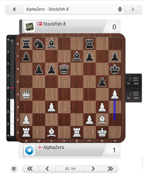 es war absehbar und nun ist es soweit. Das Team von Google DeepMind hat nach Go jetzt auch Schach mit einem auf Künstlichen Neuronalen Netzen basierenden Algorithmus angegangen. Nach 4 Stunden "Gegen-Sich-Selbst-Spielen" war bei AlphaZero bereits genug Spielverständnis da, um gegen Stockfish zu gewinnen. Allerdings vermutlich nicht auf herkömmlicher Hardware. Ich bin gespannt wie es weitergeht. Ein paar Partien finden sich hier: https://chess24.com/en/watch/live-to...tockfish/1/1/1 Viele Grüße Theo PS: Ich habe mir gerade die erste Partie angeschaut. AlphaZero hat erst einen Bauern und dann eine Figur mit scheinbar kaum Kompensation geopfert. Langfristig. Und gewonnen. Siehe Screenshot im Anhang. vielen Dank für den hoch interessanten Link. Sieht spektakulär aus. Natürlich wäre es wichtig, diverse Rahmenbedingungen dieses Wettkampfs, wie z.B. verwendete Hardware, etc. zu kennen. Gruß Egbert Geändert von Egbert (06.12.2017 um 13:06 Uhr) Grund: Typo |
