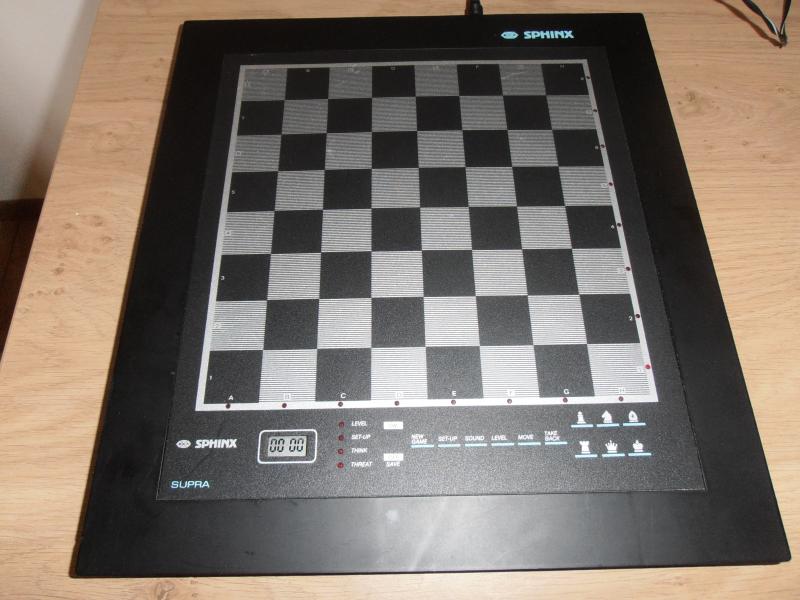 09-1989[C-4076] CXG -Sphinx SupraEen eenvoudig model. Dat is deSupra(CXG 048), maar wel vrij zeldzaam bij verzamelaars aan te treffen! Foto's zijn schaars, en we moeten het daarom doen met vage afbeeldingen. De CXG Sphinx Supra heeft een vlakke behuizing met een kleine display voor de schaakklokken. CXG Sphinx Supra–CXG 048Europa-Rochade, August 1990, Hans-Peter Ketterling: Neues aus Nürnberg Weiterhin ist Supra (CXG-048) zu nennen, ein einfaches Drucksensorgerät mit einer Spiel-fläche von 21 x 21 cm, LC-Display, Stellungsspeicher und 64 Spielstufen das einen mit 1 MHz laufenden 4-Bit-Singlechip und ein Programm von 5 KByte enthält. Ein Batteriesatz reicht für 150 h, die Spielstärke ist nur für Einsteiger ausreichend. Der Preis wurde nicht ge-nannt, dürfte aber um DM150,00 (€ 75,00) liegen. (Auszug aus dem Bericht vonKetterling.) Programmierer / Programmer• David Levy & Mark Taylor (!)Baujahr / Release• Erste Erscheinungsdatum: September (?) 1989 (!)Technische Daten / Technical specifications• Mikroprozessor: 4-bit single-chip(CXG brochure)• Taktfrequenz: 1MHz(CXG brochure)• Programmspeicher: 4K x 10 bitROM(CXG brochure)• Arbeitsspeicher: 160 byte x 4 bit RAM(CXGbrochure)Spielstärke / Playingstrength• Spielstärke (DWZ/ELO):ca. 1000Verwandt / Related•CXG -Sphinx Granada (CXG 247 & CXG 347)•CXG -Sphinx Royal (CXG 240)•CXG-Sphinx Seville (CXG 807)•CXG -Sphinx Sierra (CXG 647W)•CXG -Sphinx Spirit (CXG 337)•Mephisto -Merkur•Excalibur -Stiletto Deluxe (model 638E = CXG Sphinx Sierra)•Schneider -Sphinx Junior (CXG 237)•Schneider -Sphinx Granada (CXG 247)