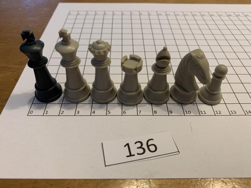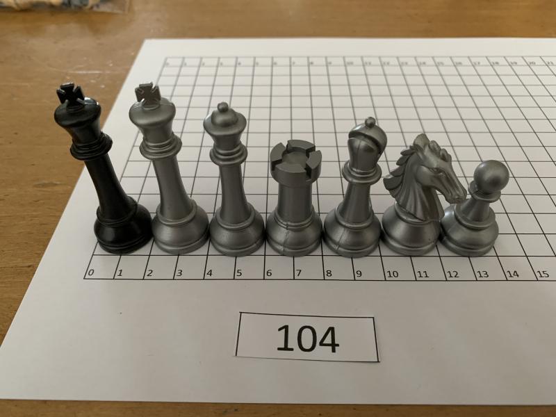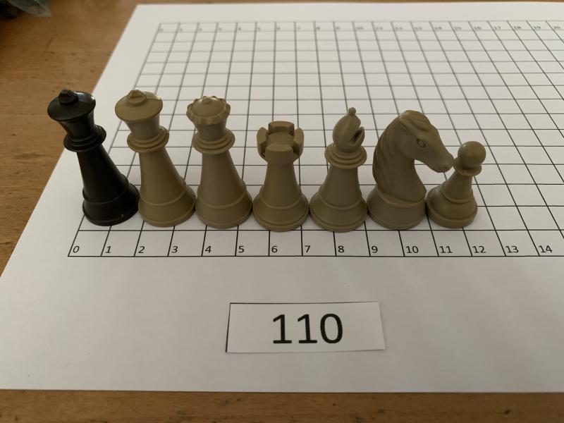 Hier noch einige: 100/101 - Saitek Turbo Advanced Trainer und/oder Mephisto Master Chess (der MC hat schwarze Figuren mit etwas metallischerem Glanz) 104/123 - CXG Super Enterprise (Schwarzes brett), - CXG Enterprise S - CXG Computachess III (CXG 008) (siehe auch https://www.schach-computer.info/wik...ack_pieces.jpg) 106 - Mephisto Modular brett 107 - CXG Super Enterprise (Braunes brett) - CXG Enterprise S (Braunes brett) - Multitech Enterprise (CC 009) 109 - gleiche Form wie 107, aber kleiner!?. 110 - Die Kreuze der Könige sind abgebrochen. Sie können entweder vom Tandy 1850 oder vom Saitek Team Mate stammen. Siehe auch 125. 114 - Novag figuren, das kann man am Springer erkennen. Z.b. Beluga, Emerald, Aquamarine RISC II, Zircon, Zircon II, vielleicht auch Super Forte. 116 - Selbe grösse und form wie RadioShack Champion 2250XL, diese sind aber metallisch, anders dann meiner 2250XL 118 - CXG Enterprise S ? 129 - Typische Novag figuren, aber welches brett? Spielfeld sollte etwas grösser sein als 20x20 cm.