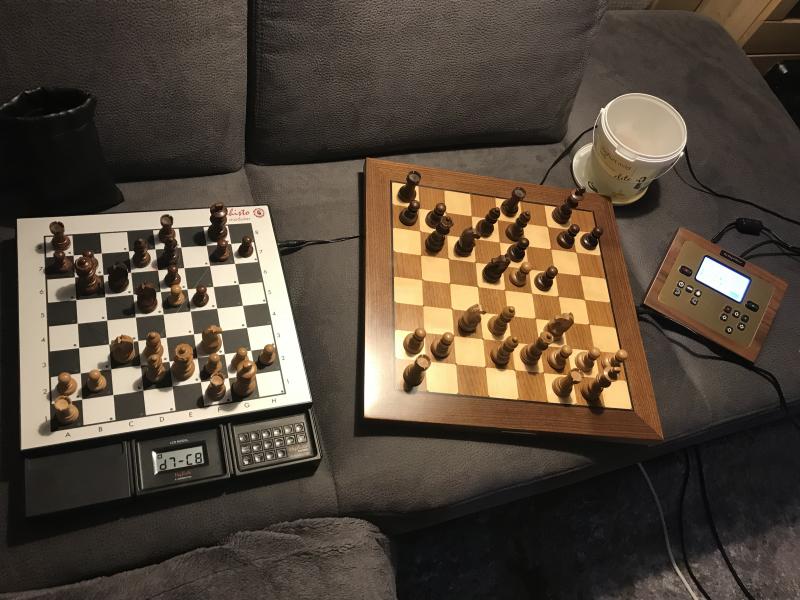 [Event "40/120 08-2023"] [Site "SCW"] [Date "2023.08.23"] [Round "1"] [White "Mephisto Risc II"] [Black "Mephisto 68000 London"] [ECO "D22"] [Result "1/2-1/2"] 1. d4 d5 2. c4 dxc4 3. Nf3 Nf6 4. e3 Bg4 5. Bxc4 e6 6. h3 Bh5 7. Nc3 a6 8. g4 Bg6 9. Ne5 Nbd7 10. Nxg6 hxg6 11. Bf1 c6 12. g5 {"} Nd5 {"} 13. e4 Nxc3 14. bxc3 Be7 15. f4 Qa5 16. Bd2 Qa3 17. Qb3 Qxb3 18. axb3 Kf8 19. Be2 c5 20. b4 cxb4 21. cxb4 Rd8 22. b5 axb5 23. Bxb5 Nb6 24. Kf2 Nc8 25. Ra8 Nd6 26. Rxd8+ Bxd8 27. Bb4 Be7 28. Bxd6 Bxd6 29. Kg3 Ke7 30. Rb1 Bc7 31. Bc4 b6 32. Ra1 Rd8 33. Ra7 Rd7 34. Kf3 Bd6 35. Rxd7+ Kxd7 36. Bb5+ Ke7 37. Bc6 Bb4 38. d5 Bd2 39. dxe6 Kxe6 40. Bd5+ Ke7 41. Bc4 Ke8 42. Bb5+ Ke7 43. Kg4 Be1 44. Ba6 Bc3 45. Kf3 Bd2 46. e5 Kd7 47. Ke4 Bc1 48. Bc4 Ke7 49. Bd3 Bd2 50. Bb5 Ke6 51. Bc4+ Ke7 52. Bf1 Ke8 53. Bb5+ Ke7 54. Ba4 Bb4 1/2-1/2 Ganz anders die nächste Partie des Risc2 gegen den Novag Star Diamond: [Event "40/120 8-2023"] [Site "SCW"] [Date "2023.08.24"] [Round "1"] [White "Mephisto Risc II"] [Black "Novag Star Diamond"] [ECO "C09"] [Result "0-1"] 1. e4 e6 2. d4 d5 3. Nd2 c5 4. exd5 exd5 5. Ngf3 Nc6 6. Bb5 Bd6 7. O-O Nge7 8. dxc5 Bxc5 9. Nb3 Bd6 10. Re1 O-O 11. a3 Bg4 {"} 12. h3 {"} Bh5 13. Bd2 Re8 14. Bc3 Qb6 15. Be2 Bf4 16. Nfd4 Bg6 17. Bd3 Bxd3 18. Qxd3 Ne5 19. Qb5 Qxb5 20. Nxb5 N7c6 21. Rad1 a6 22. N5d4 Nc4 23. Nf3 Rxe1+ 24. Rxe1 h6 25. Nc5 Bd6 26. Nd3 Rc8 27. Nd4 Nxd4 28. Bxd4 f6 29. f4 Nd2 30. c3 Ne4 31. Nb4 Bxb4 32. axb4 Kf7 33. g4 Re8 34. Re2 h5 35. Kg2 Rh8 36. f5 hxg4 37. hxg4 Rh4 38. Kf3 Rh3+ 39. Kf4 Ng5 40. Re3 Rh2 41. b3 Rf2+ 42. Kg3 Rb2 43. Rd3 Rxb3 44. Kf4 Ne4 45. Ke3 Ke7 46. Kf4 Kd7 47. Rh3 Kd6 48. Rd3 Kc6 49. Re3 Kb5 50. g5 Kc4 51. gxf6 gxf6 52. Re1 Nxc3 53. Bxf6 d4 54. Be5 Nd5+ 55. Ke4 Re3+ 56. Rxe3 dxe3 57. Bg3 e2 58. Bh4 b6 59. Bg3 a5 60. bxa5 bxa5 61. f6 Nxf6+ 62. Ke3 {RiscII gibt auf.} 0-1 Sehr ungewöhnlich, denn Novag Programme sind ja im Allgemeinen nicht so gut im Endspiel.