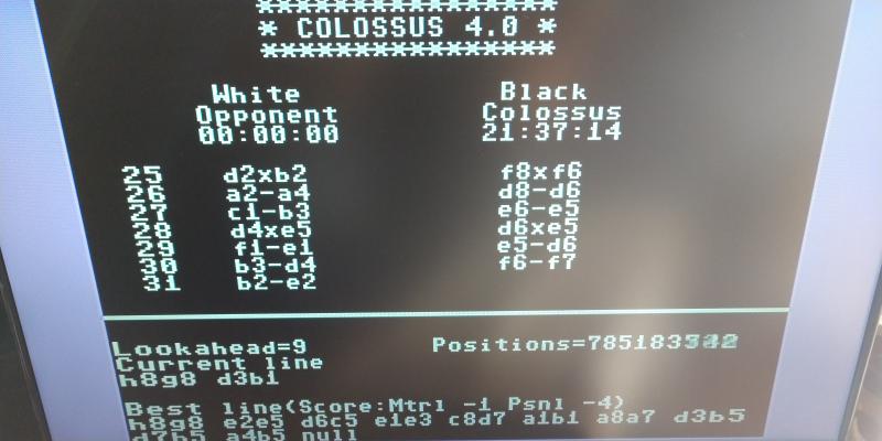 Hier ein klassisches Beispiel dafür. Da habe ich geschockt geschaut als der Zug kam. [Event "40/120 new beginning"] [Site "SCW"] [Date "2021.09.10"] [Round "1"] [White "Fidelity Kishon Chesster 8 mhz"] [Black "Colossus Chess4 C64 48 mhz"] [ECO "C04"] [Result "1-0"] 1. e4 e6 2. d4 d5 3. Nd2 Nc6 4. Ngf3 Nf6 5. e5 Nd7 6. Nb3 Bb4+ {"} 7. c3 {"} Be7 8. Bd3 f6 9. exf6 Nxf6 10. O-O O-O 11. Qc2 a5 12. Bg5 h6 13. Bh4 Ng4 14. Bh7+ Kh8 15. Bxe7 Nxe7 16. Bd3 Rf4 17. h3 Nf6 18. Qd2 Nh5 19. Ne5 Rf6 20. Ng4 Rf8 21. Nxh6 a4 22. Nc1 Nf6 23. Ng4 a3 24. Nxf6 axb2 25. Qxb2 Rxf6 26. a4 Qd6 27. Nb3 e5 28. dxe5 Qxe5 29. Rfe1 Qd6 30. Nd4 Rf7 31. Qe2 Bd7 {??} 32. Qh5+ Qh6 33. Qxf7 Ng8 34. Qxd7 1-0 Wie kann das denn sein ?!?
