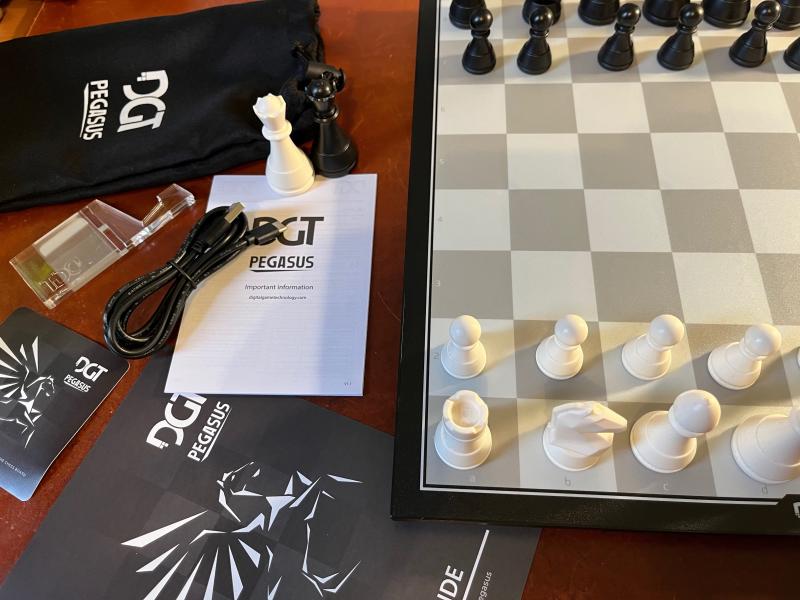 für alle Nichtbesitzer, hier eine kurzes Review. Gekommen ist alles ordentlich verpackt und die Figuren lagen, wie wohl bei DGT üblich, in einem Figurensäckchen zur Aufbewahrung. Die weißen Figuren, hatten jedenfalls bei mir, an manchen Stellen schwarze Flecken, die sich aber beseitigen lassen. Möglicherweise durch das aneinander Reiben mit ihren schwarzen Kontrahenten. Mitgeliefert wird, neben einem USB-Ladekabel, auch ein Smartphoneständer. Praktisch um die App während das Spiels im Auge zu behalten. Um anfänglichen Frust zu vermeiden: