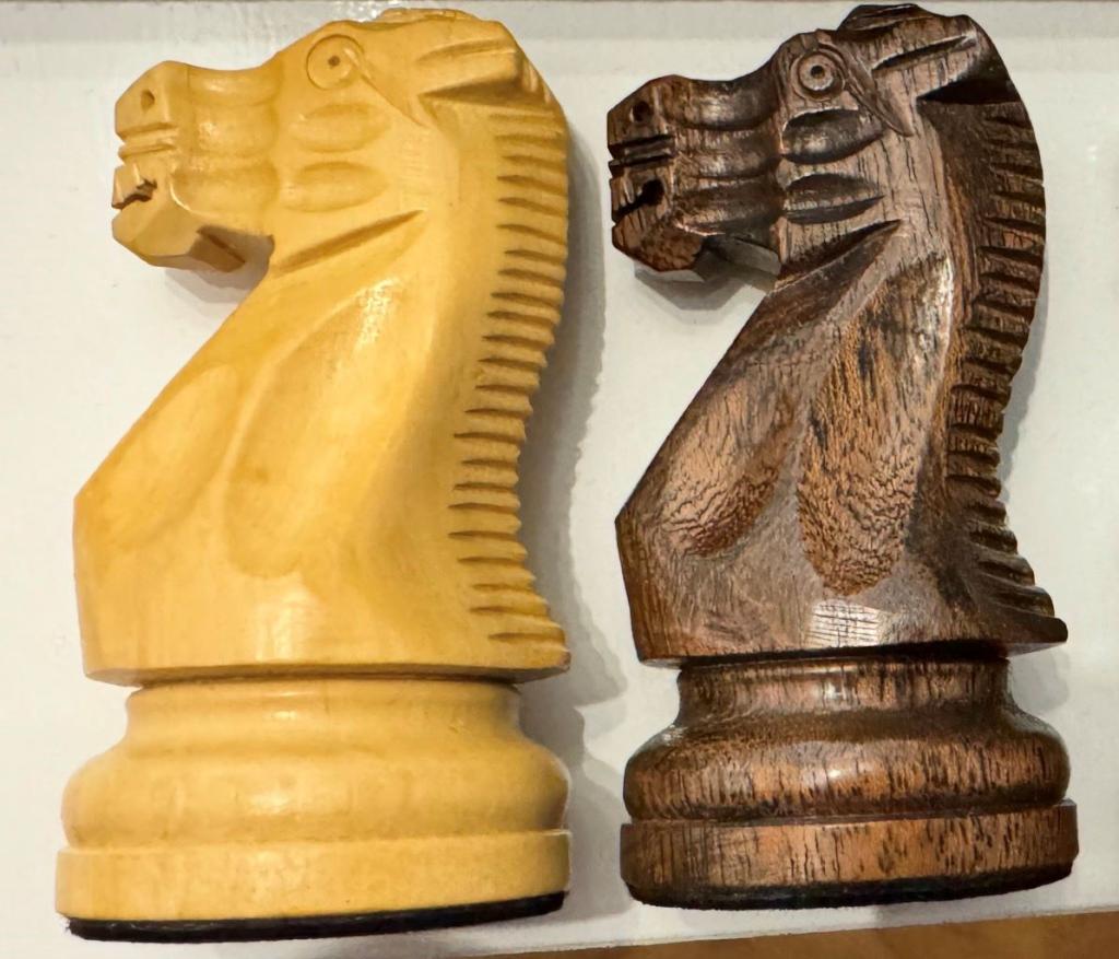 so mein Executive Ebonized Figurensatz ist heute eingetroffen. Auf den Bildern gut zu erkennen das der Springer um die Maulpartie detailtreuer geschnitzt wurde. Der Laeufer hat einen rundlicheren Kopf. Das schwarz harmoniert sehr gut mit den schwarzen Umrandungen vom Brett. Ich bin sehr zufrieden. ![]() Gruss Andre |