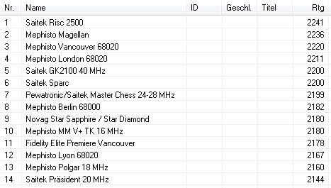 Ich habe interesse aber alle meine geräte liegen im 1680-2000 Elo Grenze (ich habe bereits 10 Compis). Mein am starksten gerät ist den Saitek Admiral, aber schon in einem online turnier sturzte er ab nach langerem spiel, ausserdem ist er ein Morsche Clone des GK2100. Danach ist der MMV 5Mhz mein am starksten gerät. Also warum nicht 1900 bis 2100 ? (stimmt überein mit ein verein A-spieler Kategorie) und 2100 bis 2250. (stimmt überein mit ein verein Expert Kategorie). Fünf Runden auf 7 wochen oder Sechs Runden auf 8 wochen erlaubt ein Urlaub wochenende (oder eben 2) . Aber wir müssen versuchen nur serien geräte und stabile compis mittbewerben zu lassen um also zu ermöglichen das ein Ander das spiel übernehmen kan. Ebenso gibt es viel 'gepimpten' compis and dies ist in Paradox mit das motto um auch einsteiger mittbewerben zu lassen. Die dargestellte liste entspricht vielliecht die am besten geräte aber stellt sich der Frage ob damit nicht das publikum eingeschränkt wird. Aber gut manche wollen nur wissen ob Ihren hochgerustete Compi ensprichend starker spielt. Also im diesem ELO bereich kan ich leider nicht mitspielen. Mfg, Stefan Geändert von StefanT (09.09.2014 um 18:52 Uhr) |