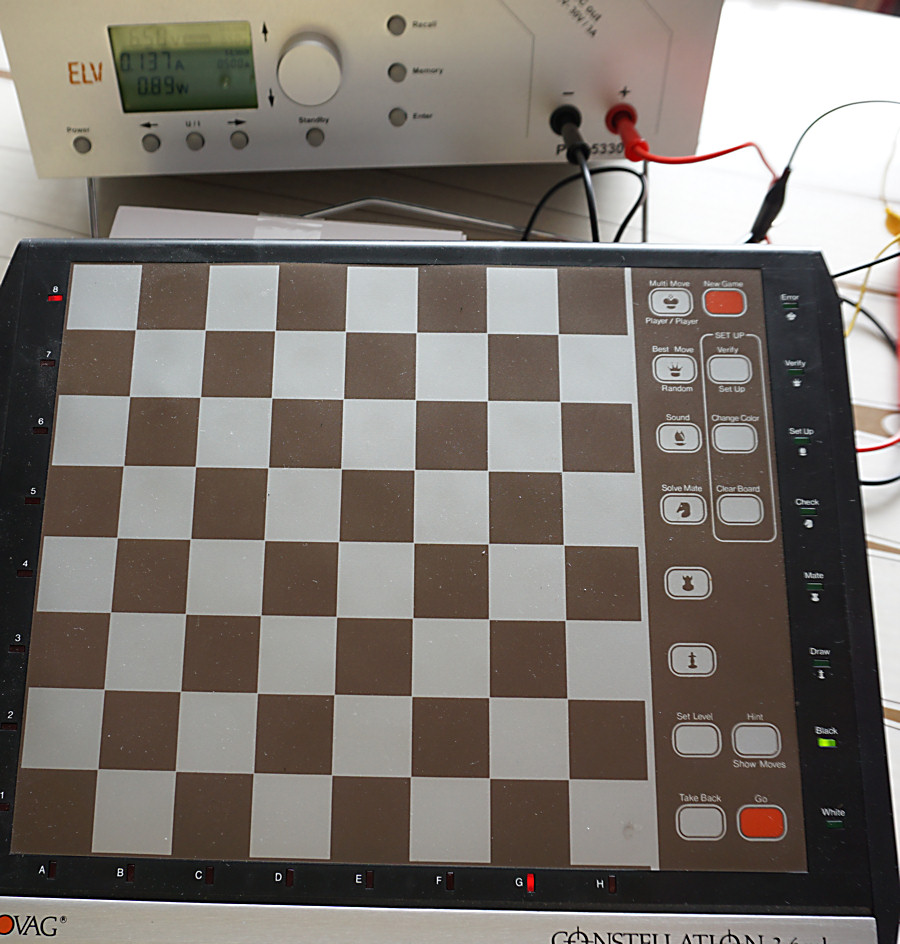 Und damit komme ich zurück zur Eingangsfrage, dem Thema Novag Constellation 3,6 MHz. Der Netzanschluss sieht 8,5 Volt (AC) hervor. Gehst du mit mit 8,0 Volt (DC) oder weniger an diesen ran, ist das zu wenig. (Dauerpiepton, der Computer hängt sich auf). D.h. Ein handelsübliches, preiswertes Univesalnetzteil müsste mit 9 Volt betrieben werden. Das Batteriefach ist für sechs Babyzellen vorgesehen. Das überrascht. Wären 6 x 1,5 Volt doch 9 Volt. Tatsächlich reicht hier aber eine Betriebsspannung von 6,5 Volt völlig aus. Stabiler Betrieb, LEDs hell. Erst wenn ich unter 6,0 Volt gehe, gibt's die Schwierigkeiten wie beim Netzbetrieb unter 8 Volt. Beim SuperForte ist es genauso. Deswegen ergänzte ich das Gerät um eine zusätzliche Buchse, die direkt auf das Batteriefach geht. So reichen 5 NiMh-Akkus. Aber auch ein gebräuchlicheres Format mit 7,2 Volt wäre natürlich kein Problem. In der Stromaufnahme liegt der Computer bei etwa 120-130 mA. Das heißt unter'm Strich: Das Batteriefach des Conny 3,6 mit Rundzellen (NiMh) bestückst, sorgt abhängig von der Akku-Kapazität, für etwa 15 bis 30 Stunden Spielspaß. Gruß Wolfgang Hallo Wolfgang, mit welchen Akkus (Typ und Hersteller) hast den den 3.6 betrieben. Da gibt es ja Qualitätsunterschiede. Gruss und vielen Dank. Michael |