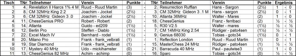danke für die Info - da hatte ich doch glatt das Ergebnis der Partie Mephisto Berlin Pro vs. Tasc CM 14 MHz King 2.54 statt der Revelation II Hiarcs 1% vs. Resurrection Ruffian eingetragen ![]() Ist aber jetzt alles wieder korrigiert - auch im Wiki! ![]() Gruß, Rüdiger