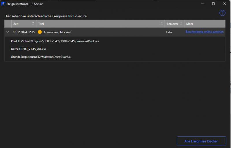Hallo, ich wollte vorhin Fritz 18 starten, und es meldete sich dabei meine Antivirensoftware, was das Schachprogramm CT 800 betrifft. Hatte jemand ähnliches bei sich bemerkt ? Ich kann das überspringen, bzw. dem Programm sagen, das dies kein Schädling ist. Aber seltsam, diese Mitteilung.