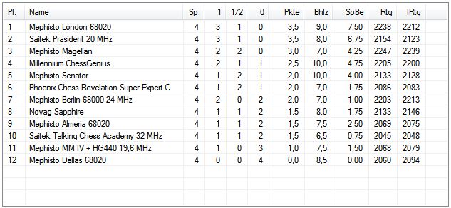 In der kurzfristig angesetzten Partie Miephisto Almeria 68020 - Novag Sapphire gab es ein leistungsgerechtes Remis (abgeschätzt durch Bediener):