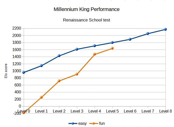 I leveraged the Spacious Mind's Renaissance School test to run thru all Easy and Fun levels of my Millennium King Performance. That's 15 levels, times 10 games to replay... a lot of runs, though worthwhile. Thankfully, the computing of moves is fast, using those levels. The results should fit any Millennium device running The King engine (the King competition, the King Element, the Exclusive Lasker edition as well...) therefore I trust this should spark interest for some here ![]() Here are the detailed results, sorted downwards by decreasing score: And the resulting graph: As a reminder, normal levels 6 (avg 30 secs/move) and 9 (tournament) achieved respectively 2482 and 2595 ratings. The graph displays rather evenly distributed levels - and confirms there is no need for fun levels over level 5 (this curve is catching up the easy levels' one). Fun levels 4 and 5 perform close to Easy levels 2 and 3 as far as strength is concerned, the difference would lie in "guess the mistakes" the Fun levels add... About Test Game 10 Nick pointed out, the King Performance also struggled raising its score across those easy and fun levels (it also failed on tournament level...). A much difficult test game! mit freundlichen Grußen, Eric |