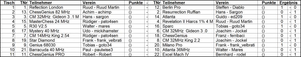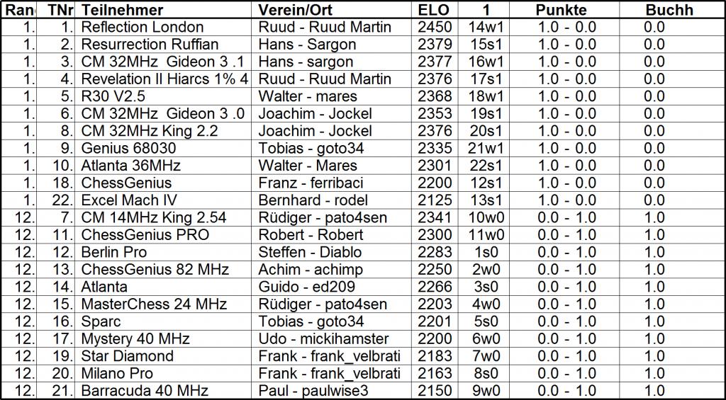 die erste Partie in Runde 2 ist soeben beendet worden. Berlin Pro schlägt erwartungsgemäß den getunten Mystery. Die Bauernvorstöße am Königsflügel in unterentwickelter Stellung haben die Partie relativ schnell zugunsten von Berlin Pro verlaufen lassen. Hier die Partie: