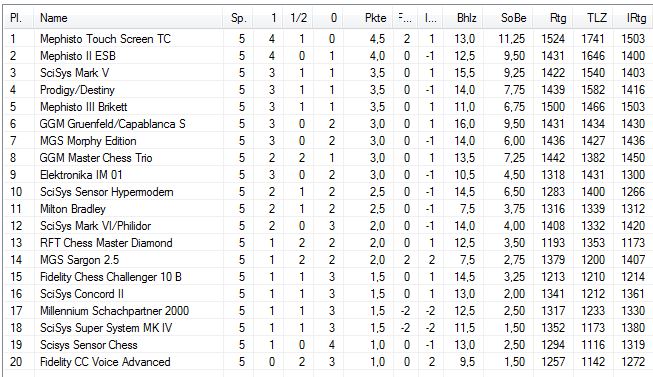Prodigy - GGM Master Chess Trio 0:1 Erneut ein firmeninternes Duell. Der kleine Prodigy greift als Erster daneben (7.Sf5?), was einen Bauern kostet. Bis ins Endspiel passiert nicht viel, erst mit der Umstellung auf Capablanca-S kann das Master Trio seinen Vorteil ausspielen. Spätestens nach 28...c3! ist die Partie für Schwarz gewonnen. GGM Gruenfeld/Capablanca-S - Mark V 0:1 Sehr gespannt war ich auf diese Begegnung. Leider wechseln beim Capablanca-S Licht und Schatten. Im Endspiel HUI, in der Eröffnung PFUI. Wenn er zu früh auf sich allein gestellt ist - wie hier - spielt er zu unorthodox und liegt oft daneben. Die Eröffnung wird komplett vermurkst, was letztendlich zum Verlust der Partie führt. Mark VI/Philidor - Fidelity CC Voice Adv. 1:0 Wer die Partie nachspielt weiß, das Ergebnis ist mehr als glücklich für den Mark VI. Der Voice Adv. tauscht nach 21...Lxf2+! die Dame gegen 2 Türme mit Initiative. Dabei übersieht der Mark VI einen gefährlichen Freibauern und nach 31...e3! steht Schwarz praktisch gewonnen. Wie der Voice Adv. das noch verliert ist ebenfalls sehenswert....erneut schlägt der "Level-Bug" (wenn man es als Bug bezeichnen will) zu. Die Züge im Endspiel werden nach wenigen Sekunden Bedenkzeit ausgespielt. Das nächsthöhere Level 4 beim CC Voice Adv. hat aber schon einen Durchschnitt von 1:20 Min., insofern muss Level 3 (Durchschnitt 35 Sek) beibehalten werden. SciSys Sensor Chess - SciSys Concord II 1:0 Der Sensor Chess kommt durch den schönen Zug 7.Sxc7! in Vorteil, bringt Schwarz um die Rochade und erhöht den Druck auf den schwarzen König zug um Zug. Eine sehr schöne Leistung, die kurz vor einem Mattangriff noch im Remis hätte enden können.....doch der Concord II übersieht 2x die Chance auf Dauerschach. SciSys Sensor Hypermodern - Elektronika IM 01 0:1 Eine sehr positionell geführte Partie. Lange Zeit solide von beiden gespielt. da hätte man auch einen ELO 1800 Schachcomputer als Gegner vermuten können. Im Endspiel holt sich der Elektronika einen Bauern am Damenflügel, was ihm dort zwei Freibauern verschafft. Der Mehrbauer am Königsflügel bringt dem Hypermodern kein Gegenspiel. Zum Schluss wird es zumindest optisch spannend, da beide einen Bauern zur Dame umwandeln. Der Elektronika IM 01 hat aber alles im Griff und setzt Matt im 55. Zug.