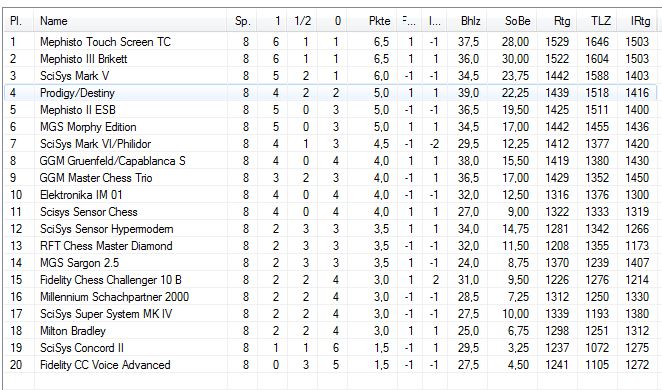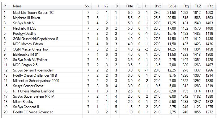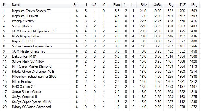 Deep Depp Advanced U1500 Runde 6 1 Mephisto Touch Screen TC - Mephisto II ESB ..... 2 SciSys Mark V - Prodigy/Destiny ..... 3 Mephisto III Brikett - Elektronika IM 01 ..... 4 GGM Master Chess Trio - MGS Morphy Edition ..... 5 GGM Gruenfeld/Capablanca S - Milton Bradley ..... 6 MGS Sargon 2.5 - SciSys Sensor Hypermodern ..... 7 RFT Chess Master Diamond - SciSys Mark VI/Philidor ..... 8 Fidelity Chess Challenger 10 B - SciSys Super System MK IV ..... 9 SciSys Concord II - Millennium Schachpartner 2000 ..... 10 Fidelity CC Voice Advanced - Scisys Sensor Chess ..... Um die Aufstiegsplätze (1-5) dürfte es in diesem Turnier ganz eng bis zum Schluss bleiben. Selbst die bislang unglücklich agierenden Mark VI und Sargon 2.5 können mit einer Serie noch weit vorne landen. Gruß, Peter |