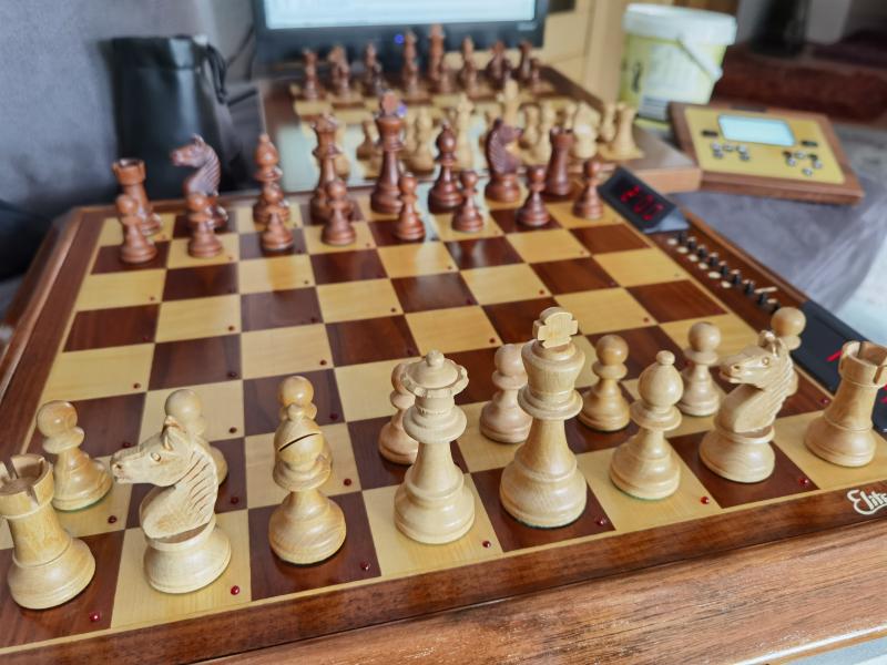 Der wunderschöne Fidelity muss sich leider dem The King geschlagen geben. [Event "40/120 new beginning"] [Site "SCW"] [Date "2021.10.31"] [Round "2"] [White "Fidelity Elite Avantgarde v9"] [Black "Mill. Excl.The King Element 10"] [ECO "A19"] [Result "0-1"] 1. c4 Nf6 2. Nc3 e6 3. e4 c5 4. e5 Ng8 5. Nf3 d6 6. exd6 {"} Bxd6 7. d4 cxd4 8. Qxd4 Nf6 9. c5 Bc7 {"} 10. Bg5 Qxd4 11. Nxd4 Nbd7 12. c6 bxc6 13. Nxc6 a6 14. Be2 Bb7 15. Bf3 Rc8 16. Rc1 h6 17. Be3 g5 18. h3 Bb6 19. Bxb6 Nxb6 20. Na7 Rc7 21. Bxb7 Rxb7 22. Nc6 O-O 23. h4 Rc8 24. hxg5 hxg5 25. Na5 Rbc7 26. Rd1 Nbd5 27. Nxd5 exd5 28. Rh3 Rc2 29. Rd2 Ne4 30. Rxc2 Rxc2 31. f3 Nf2 32. Rh6 Nd3+ 33. Kf1 Rf2+ 34. Kg1 Rxb2 35. a4 Ra2 36. Rxa6 Rxa4 37. Ra7 Ra1+ 38. Kh2 d4 39. Ra8+ Kh7 40. Ra7 Kg7 41. Nc6 Rxa7 42. Nxa7 Nb2 43. Nb5 d3 44. Nc3 d2 45. g4 d1=Q 46. Nxd1 Nxd1 47. Kg3 Kf6 48. f4 Ne3 49. Kf3 gxf4 50. Kxf4 Nxg4 51. Kxg4 0-1 Der Saitek Sparc schlägt den Tiger Grenadier. [Event "40/120 new beginning"] [Site "SCW"] [Date "2021.10.31"] [Round "2"] [White "Tiger Grenadier"] [Black "Saitek Renaissance Sparc"] [ECO "D05"] [Result "0-1"] 1. d4 Nf6 2. Nd2 d5 3. Ngf3 {"} e6 {"} 4. e3 c5 5. Be2 cxd4 6. exd4 Bd6 7. O-O Nc6 8. c4 O-O 9. c5 Bc7 10. Bd3 Re8 11. Rb1 Bd7 12. Qb3 b6 13. Qc3 e5 14. dxe5 Nxe5 15. cxb6 axb6 16. Nxe5 Bxe5 17. Qb3 Ba4 18. Qb4 Bd6 19. Qh4 Qd7 20. a3 Bb5 21. Bxb5 Qxb5 22. Qg5 Re5 23. Qg3 Rae8 24. b4 R5e6 25. Qg5 Re2 26. h3 Qd7 27. Qh4 Qf5 28. Qd4 Be5 29. Qxb6 Bc3 30. Rb3 Bxd2 31. Bxd2 Rxd2 32. Rf3 Qc2 33. Rg3 Ne4 34. Qb5 Rc8 35. Rf3 Qc4 36. Qxc4 Rxc4 37. Rf5 f6 38. g3 Rc3 39. Ra1 Rcc2 40. g4 Nxf2 41. Rxf2 Rxf2 0-1 Und nach langem hin und her, die der Novag auch noch hätte verlieren können, aber Brute Force hat es einfach übersehen, endet die Partie in einem Remis. [Event "40/120 new beginning"] [Site "SCW"] [Date "2021.11.01"] [Round "2"] [White "Saitek Ren.Brute Force Modul"] [Black "Novag ConstellationExpert 100"] [ECO "B99"] [Result "1/2-1/2"] 1. e4 c5 2. Nf3 d6 3. d4 cxd4 4. Nxd4 Nf6 5. Nc3 a6 6. Bg5 e6 7. f4 Be7 8. Qf3 Qc7 9. O-O-O Nbd7 10. Bd3 h6 11. Bh4 {"} g5 {"} 12. fxg5 Ne5 13. Qe2 Nfg4 14. Nf3 Nxf3 15. gxf3 hxg5 16. Bg3 Ne5 17. f4 gxf4 18. Bxf4 Ng6 19. Bg3 Bd7 20. Qf2 Ne5 21. Bxe5 dxe5 22. h4 Qc5 23. Qxc5 Bxc5 24. Kd2 O-O-O 25. h5 f5 26. Rde1 Bc6 27. Rh3 Bb4 28. a3 Ba5 29. exf5 e4 30. b4 exd3 31. bxa5 dxc2+ 32. Kxc2 exf5 33. Re7 Rh6 34. Rf7 Be8 35. Rxf5 Bg6 36. hxg6 Rxh3 37. g7 Rg3 38. Rf7 Rg4 39. Kb3 Rg6 40. Ne4 Rg2 41. Nc5 Rg3+ 42. Kc4 Rg4+ 43. Kc3 Re8 44. Rf8 Kd8 45. Rf7 Re3+ 46. Kd2 Reg3 47. Nxb7+ Kc8 48. Nd6+ Kb8 49. Nf5 Rg1 50. Ke3 R1g2 51. Re7 Rg6 52. a4 R2g4 53. Kf3 Rg1 54. Rd7 R6g4 55. Ke3 Rg6 56. Rf7 R1g4 57. Kf3 Rg1 58. Ke4 R1g5 59. Kf4 Rg1 60. Ke5 R1g5 61. Re7 Kc8 62. Ra7 Kb8 63. Rf7 Kc8 64. Kf4 Kb8 65. Rd7 Rg1 66. Re7 Rf1+ 67. Ke4 Re1+ 68. Ne3 Reg1 69. Nf5 Kc8 70. Kd5 Rd1+ 71. Kc4 Rdg1 72. Kd4 Kd8 73. Rb7 R1g5 74. Ke5 Kc8 75. Re7 Kb8 76. Ke4 Kc8 77. Ra7 Kb8 78. Rf7 Rg1 79. Kd5 R1g5 80. Ke4 Rg2 81. Kd4 R2g4+ 82. Ke3 Rg1 83. Kd3 R6g5 84. Ke4 R5g4+ 85. Kd5 Rg5 86. Ke6 R1g4 87. Kf6 Rg6+ 88. Ke7 Rg1 89. Ke8 Ka8 90. Kf8 Rd1 91. Ne3 Rdd6 92. Re7 Rdf6+ 93. Ke8 Kb8 94. Nd5 Rd6 95. Nf4 Rg4 96. Re6 Kc7 97. Rxd6 Kxd6 98. Nh5 Kc5 99. Kf7 Rxg7+ 100. Nxg7 Kb4 101. Ke6 Kxa4 102. Kd5 Kxa5 103. Kc5 Ka4 104. Nf5 Ka3 1/2-1/2