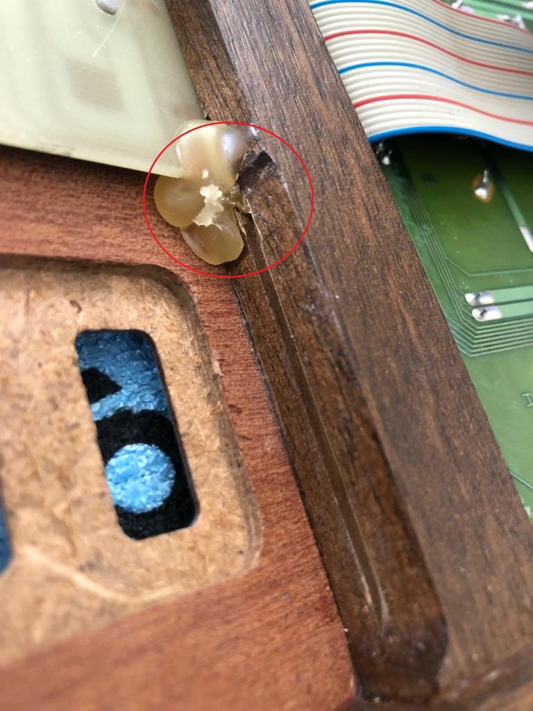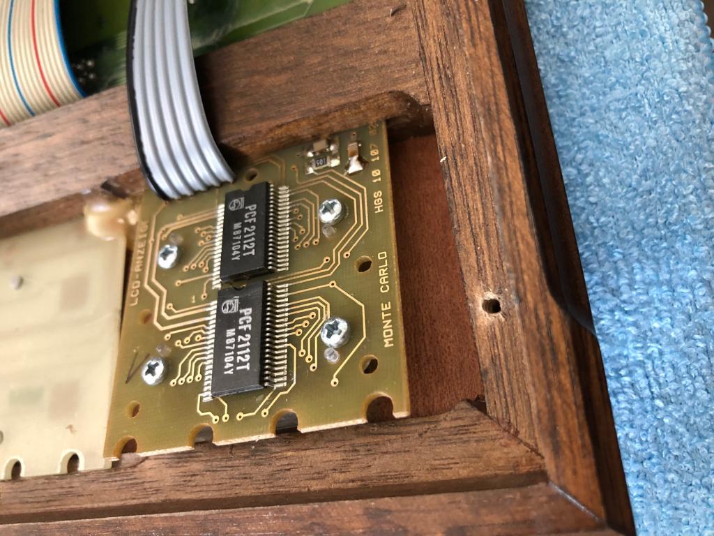 Naja, man weiß nicht, wer schon Hand angelegt hat. Wichtig ist, die Platine muss leicht angehoben werden, damit sie entnommen werden kann. Hintergrund sind die Plastikabdeckungen der Displays, die in den Holzkorpus eingelassen sind. Heißt, erst die Verklebung lösen, ankippen und herausziehen.