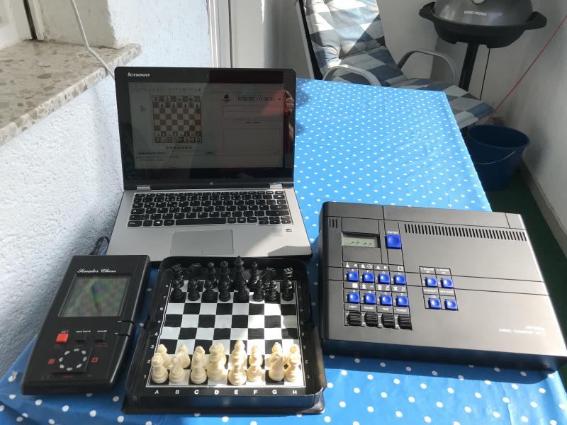 Auf dem Balkon hingegen findet gleich die CO2 freie Partie zweier Schachcomputer statt die auch im Sonnenlicht gut zu bedienen sind: