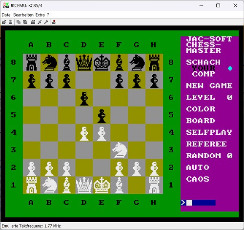 Should you like to give it a fast and easy try: https://lanale.de/kc85_emu/KC85_Emu.html then use your browser search on the page, keyword Schach (of course!), click on the screenshot and there you go. or get the JKCEMU software (java) from here: http://www.jens-mueller.org/jkcemu/ plus the video chessmaster game from here: http://kc85.info/index.php/download-...ss-master.html and so you can run it locally on your PC, which is what I did: You may need to resize the JKCEMU window: Menu Extra-Ansicht Select the emulated hardware (I chose KC85-4): Menu Extra-Einstellungen, select, activate (Übernehmen). Now you may save this setting as a profile; name it accordingly. I used kc85-4 as the name, this created the profile file prf_kc85-4.xml (you can check the target directory in the rightmost tab (sonstiges) of the settings. I would suggest to create a small .bat or .cmd file in order to automatically launch the emulator using this profile, such as: start jkcemu-0.9.3.jar kc85-4 (adapt the version number to the one you downloaded, mine is rather old - but fine). Once the KC85 runs, you get the standard KC-CAOS menu. Load the chess.kcc game file (menu Datei-Laden). Type and enter CHESS, you are done. Moves are input using basic algebraic format like E2E4. Commands can be input using only two chars: NE new game LE'enter'0-7 --> level CO swaps color with computer (exits referee or selfplay modes) CA quits BO set board / exit board setting thanksfully, entering a position is not done the same way as the chess computer, it is more usual. Funny enough, the software uses english for commands , but the pieces names are german (this puzzled me for a while before I found this out!). e.g. : BE4 adds white bauer at e4 square 'space'E4 removes the piece from e4 square -BE4 adds black bauer at e4 Time ago I used the JKCEMU for the GDR chess computers SLC-1 and SC-2, no more as they are now available thru Franz's CB-EMU. But I still use it for the SC-80... Have fun! Tibono |