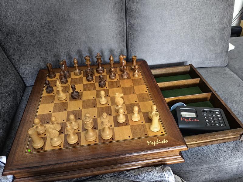 Aber zurück zu unserem Turnier. In der vorletzten Partie der 1. Runde hat der PsiChess auf dem Spectrum hat keine Chance gegen den Profi Cyrus. [Event "40/120 zeptepi"] [Site "SCW"] [Date "2024.05.24"] [Round "1"] [White "Psi Chess ZX Spectrum"] [Black "Cyrus Chess Dragon 32"] [ECO "C02"] [Result "0-1"] 1. e4 e6 2. d4 d5 3. e5 c5 4. dxc5 {"} Nc6 {"} 5. b4 Nxb4 6. Be3 Qa5 7. c3 Nc6 8. Nf3 Bxc5 9. h4 Bxe3 10. fxe3 Qb6 11. Qd2 Nge7 12. Be2 Nf5 13. Kf2 O-O 14. Rd1 Qc5 15. h5 Nh6 16. Kg3 Nf5+ 17. Kf4 f6 18. g4 fxe5+ 19. Nxe5 Nxe3+ 20. Kg3 Nxd1 21. Nxc6 Qf2+ 22. Kh3 Rf3+ 23. Bxf3 Qxf3+ 24. Kh4 bxc6 25. Qd4 e5 26. Qg1 Nf2 27. Nd2 Qh3+ 28. Kg5 Bxg4 29. Qh2 Qxh2 30. Rh1 Qxh1 31. h6 Qxh6# 0-1 Jetzt fehlt nur noch Mephi II ESB im schicken Holzbrett gegen Philidor Chess auf dem XT PC. Philidor hat weiss. Mehr in diesem Theater in kürze... Philidor B1 läuft auf einem IBM XT mit 8088 4.77 mhz. D.h. in der Dosbox stelle ich 315 cycles ein !!