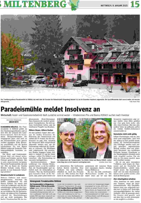 Da kann man auch Fotos der Köhlich-Schwestern sehen. Ich denke, dass wir das Turnier ohne Probleme durchziehen können. Da ich früher im Kreditgeschäft tätig war und gelegentlich mit Insolvenzen zu tun hatte, will ich meine Einschätzung abgeben. Alle Beteiligten - von den Eigentümerinnen über die Banken und anderen Gläubigern bis hin zu einem möglichen Insolvenzverwalter - dürften größtes Interesse haben, den Geschäftsbetrieb normal weiterlaufen zu lassen. Wird der Betrieb erst einmal eingestellt, dann ist er wegen Personalmangel unter den heutigen Bedingungen kaum wieder in Gang zu bringen. Und ohne Restauration und Hotel ist auch die Immobilie nur noch einen Bruchteil wert. Also wird es weitergehen, weil nur so die Gläubiger - und hier vor allem die Banken - am meisten von ihren Forderungen retten können. Aber etliche Gläubiger werden Geld einbüßen. So ist es auch vom Gesetzgeber gewollt, Schuldenlast runter, aber der Betrieb soll möglichst nicht vernichtet werden, sondern weitergehen. Nur empfiehlt es sich vorsichtshalber, keine Vorauszahlungen zu leisten, sondern erst nach erbrachter Leistung zu zahlen. Ihr könnt aber der Paradeismühle weiterhelfen, indem ihr möglichst umfangreich zecht und viel Geld dort lasst :-) Nachtrag: der Artikel hat beim Hochladen entscheidend an Auflösung verloren, also könnt ihr euch nur ein optischen Gesamtbild davon machen. Immerhin sind die Köhlich-Schwestern noch leidlich zu erkennen. |