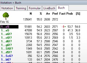 Zuggewichtung (Spalte Fact). Dieser Wert geht von -125 bis +125. Er beeinflußt die Wahrscheinlichkeit, mit der ein Zug ausgespielt wird. Das Programm ändert diese Werte nach seinen "Erfahrungen" mit Eröffnungsvarianten. Man sagt: "Das Eröffnungsbuch lernt". Weiterhin sind diese Werte, im Programm "Wichtungen" genannt, vom Anwender einstellbar. Per Tastatur mit SVY und AVY. Per Maus durch Anklicken der Felder "<" und ">" rechts neben den Werten. Positive Wichtungen erhöhen die Ausspielwahrscheinlichkeit. Ein Zug mit Wichtung +125 wird immer gespielt, ein Zug mit Wichtung -125 nie.