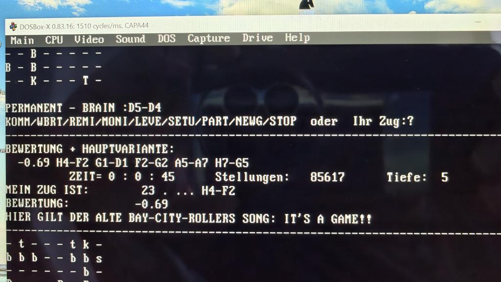 Daher mag ich ja das man in der dosbox die Programme alle mit cycles auf das Niveau abschwächen kann, das man benötigt. Ich habe mir jetzt zu dem 55 euro mini Toshiba 2 in 1 Laptop/Tablet noch ne 256 GB Speicherkarte für 17 euro gekauft. Dort habe ich alle emulationen, musik und videos draufgepackt. Und vorhin habe ich auch ausprobiert über ein mini hdmi Kabel einen 2. Monitor anzuschließen. Ich bin vollkommen zufrieden mit dem was ich für wenig Geld für mein CO2 freies Hobby erreicht habe. Das einzige was ich noch nicht geschafft habe ist den VLC 32 bit zu installieren. Weil der will immer den 64 bit VLC installieren. Selbst wenn ich den 32 Bit auswähle versucht das vlc Installationsprogramm dann doch den 64er zu installieren. Der erkennt wohl nicht das ich 32 Bit benötige. Capa44 jedenfalls kann Unterverwandlungen. Es gibt nur einen Bug der im Moment Unterverwandlungen des Gegners verunmöglicht ( man kann sie nicht eingeben) . Da muss man mit Stellungseingabe (SETU) operieren. Das Programm hat permanent brain, hat einen Monitor Modus (MONI) um Zugfolgen einzugeben, man kann auch die Notation der Partie abrufen (während der Partie mit dem PART Befehl), Kommentare und Rechentiefe und Bewertungen werden mit abgespeichert und in einem pseudo-pgn Format automatisch auf die Festplatte gespeichert wenn man das Programm (mit STOP) verlässt . Diesen Pseudo-PGN Text kann Fritz bzw. die CB-GUI dann in echtes PGN parsen. Das Programm gibt auch in aussichtslosen Stellungen auf. Um den Permanent-Brain-Zug dann zu übernehmen muss man ihn nicht eintippen. "Space" drücken und Enter und der Zug wird übernommen. Bei Mephisto II ist das ja ähnlich. ENT drücken und STA und Mephi II führt auch den PB Zug aus. Kommentare werden mit KOMM ein/ausgeschaltet und man kann mit REMI Remis anbieten. Hat man mal aus Versehen die Spielstufe zu hoch gesetzt und man will den Zug abdrücken hilft ESC auf der PC Tastatur. Beim der nächsten Möglichkeit spielt CAPA den Zug dann aus. Die Bedienung sollte eben möglichst komfortabel sein für ein BASIC(-DOS)-Programm. Ferner wollte ich gerne Gesamtknoten und NPS, Bedenkzeit, Hauptvariante , Rechentiefe und Bewertung und Permanent-Brain-Zug ausgeben während des Rechnens. Denn das machen meine Schachcomputer ja auch so toll. Franz wollte das Programm aber nicht in seine DOS-Sammlung mit aufnehmen, weil es keine Grafik sondern nur eine Textdarstellung hat und auch keine Mauseingabe sondern nur Texteingabe hat. Allerdings habe ich mit WBRT (für Wechsel Brett) zwei unterschiedliche Text-Darstellungen (Bretter) parat.