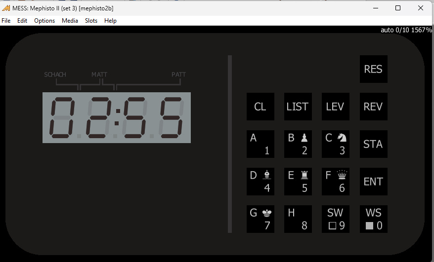 Mephisto II Brikett 6,1 Mhz, keine Lösung des 5-Zügers in 20 Stunden.