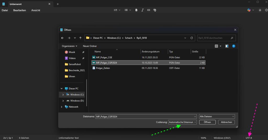 ich versuche es mal mit einem Bild zu veranschaulichen. Ich verwende Notepad. Wenn ich es richtig in Erinnerung habe, musste ich das bei Windows 11 nachinstallieren. Notepad zeigt unten rechts immer UTF-8 an. Dann gehe ich im Editor auf "Datei öffnen", und muss unten, wo "Automatische Erkennung" steht, auf "ANSI" umstellen. Dann passt alles. Gruß, Wolfgang |