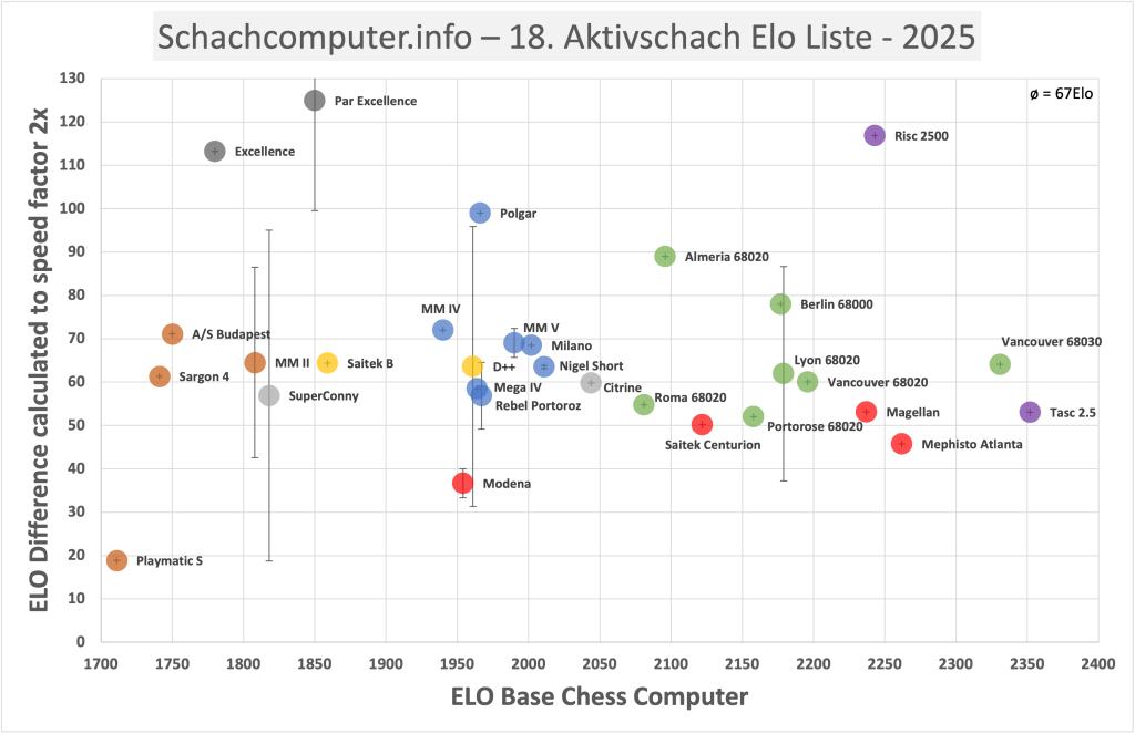 Allerdings was die Richard Lang Programme betrifft, muss man von einer deutlichen Reduzierung des Spielstärke-Zuwachses pro Verdoppelung ausgehen. Das liegt an der passiven Spielanlage, der (Über)-Bewertung von Bauernketten/-Strukturen, der fehlenden Aggressivität und des oft verfrühten Einsatzes der Dame. ... ich habe mal die aktuelle Aktivschachliste der Geräte analysiert, die „getunt“ sind bzw. in unterschiedlichen Taktfrequenzen vorliegen. Dabei zeigt sich: Viele der hier geäußerten Aussagen zur besonders starken oder besonders schwachen Spielstärke-Skalierung werden durch die Daten so leider nicht gestützt! Wie habe ich die Statistik ausgewertet? Ich normiere alle Elo-Differenzen auf eine Taktverdopplung. Grundlage ist die Annahme, dass der Elo-Zuwachs linear zum Logarithmus ist. Beispiel Super Constellation: Elo-Unterschied 179. Frequenzverhältnis 16/5 = 3,2. Log_2(3,2)=1,68 --> ELO_2=179/1,68=107 Ergebnisse (aus der Normierung auf Verdopplung)