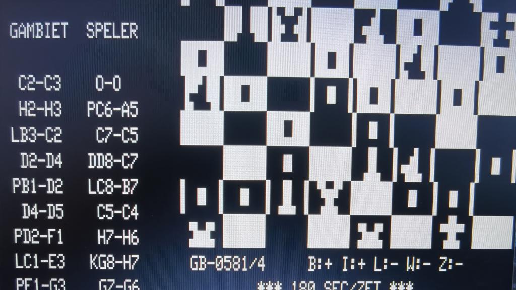 Es ist Wim Rens (NL) Gambiet 81 auf dem z80 TRS-80 gegen Chess 7.5 C64. M.E. eine Spitzenpaarung denn von beiden Programmen halte ich sehr viel. Wim Rens hat seine niederländische Engine kommerziell gemacht , als wir alle noch von Computerschach geträumt haben, 1981, indem er die Software an Philips und deren Videokonsole verkaufte. https://www.chessprogramming.org/Gambiet Wim Rens war kommerziell in einer Zeit, in der David Broughton es auch war mit dem SciSys MKV. Eine Hochzeit. Eine erste Zeit, bei den alten Ägyptern auch Zep Tepi genannt. Als die Götter unter uns wandelten. Was gäbe ich darum. Dort herumgeschlichen zu sein. Unter Göttern. Und Chess 7.5 ist in genau derselben Weise ein Dinosaurier, nämlich ein Ableger von Larry Atkin der es 1984 veröffentlichte. Hier auf dem Foto sieht man Wim Rens externes Schachcomputermodul das nicht auf der Videokonsole läuft, wohl aber wie ein Schätzle Turbokit mit Kabel daran angeschlossen ist. Eine externe Hardware genau wie die „externe Chessmachine“ für den C64 von TASC oder andere externe Lösungen. Erinnert an meinen Laptop mit Thunderbolt Ausgang den ich an meine externe Nvidia 3070 anschließe. Auf dem 2. Foto wie die "Grafik" von Gambiet dann auf dem TRS 80 aussah. Schon krass.