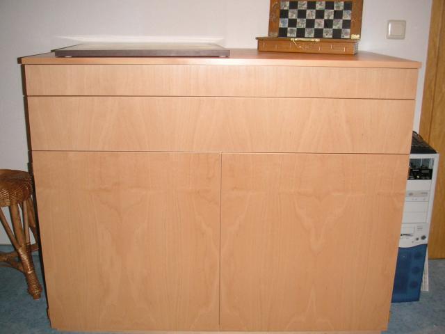 diese Lösung war für mich die Beste, da ich mit Koffern nicht soviel anfangen kann. Der Schrank ist gleichzeitig Ablage und Möbelstück in einem, das kannste mit Koffers nicht so wirklich - schmunzel. ![]() Desweiteren haben mich die Kosten für 8 Koffer abgeschreckt, der Schrank war dann doch erheblich günstiger. Dafür kann ich aber den Schrank nicht mitschleppen, da sind die Koffers wieder im Vorteil. Am Anfang sollten alles Schubladen werden, das habe ich dann verworfen, irgendwann sind die Bretter ja mal weg. Dann kann der Schrank noch genutzt werden, für andere Sachen. Der Schrank ist 1,2 m x 1,0 m x0,66 m, hat 2 verschiedene Schubladen und 5 ausziebare Einlegböden. An den Einlegböden sind Stopper montiert um das totale Herausziehen zu verhindern. Herzliche Grüße Jörg - Uwe |
