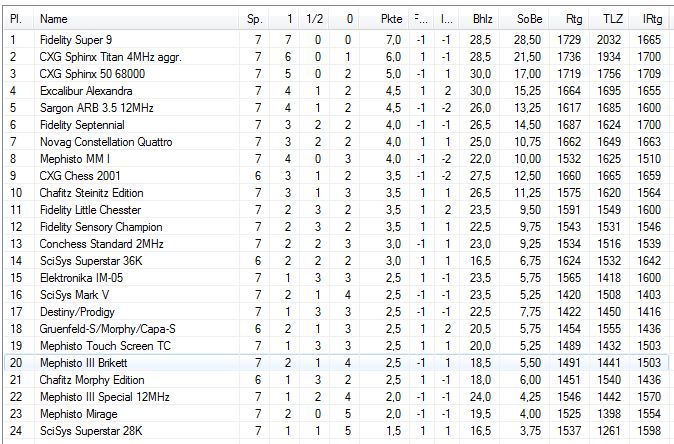 mittlerweile ist Runde 8 weit fortgeschritten und bringt ein wenig Leben in die Tabelle - sprich Überraschungen ![]() Mephisto III Special 12MHz - Mephisto Mirage = 1:0 Nachdem das Turnier für den schnellen III Special bislang schlecht lief, konnte er gegen seinen älteren Bruder Mirage (quasi ein schnellerer Mephisto II) bezwingen. Mit 24.Lxh7+ fischt der III Special im Trüben, doch der Mirage ist zu ängstlich um den Läufer zu schlagen. Zum Gewinn langt es aber erst nach einem Patzer vom Mirage im 44. Zug. Mephisto III Brikett - Elektronika IM-05 = 1:0 Lange Zeit ausgeglichene Partie. Der IM-05 versucht einen Angriff am Damenflügel und lässt seine Bauern laufen, vernachlässigt dabei aber seinen Königsflügel. Dies kann der Mephi III ausnutzen und verleibt sich ein paar Bauern ein. Zum Ende wird es dann nochmal spannend. IM-05 bekommt seinen Freibauern bis nach B2 gerückt, findet leider nicht das richtige Abspiel. Nach 45...Txg5? (richtig war Tb5) kommt der weiße Läufer des IIIer rechtzeitig um den Bauern B2 abzufangen. Fidelity Septennial - Fidelity Sensory Champion = 1/2 Der Septennial wählt überraschend ein Königsgambit und kommt prompt in eine Variante die auch der Sensory Champion gespeichert hat. So kann es gehen bei Partien vom selben Hersteller. Nach dem Buchende hat der Septennial bereits die Rochade aufgegeben und kann überhaupt nichts mit der Stellung anfangen, während sein gegenüber 0-0-0 spielt mit klarem Vorteil. Innerlich hake ich die Partie bereits ab, so schlecht stehen die Figuren vom Septannial....aber die Hoffnung stirbt zuletzt. Er kämpft sich zurück im Endspiel und schafft am Ende tatsächlich noch ein Remis durch zugwiederholung. Fidelity Super 9 - SciSys Superstar 36K = 0:1 Der Supermann des Turniers - der Super 9 - bekommt in Runde 8 den ersten Dämpfer nach 7 Siegen in Folge. In der Eröffnung verschenkt der Super 9 zu viele Tempi mit unnötigen Damenzügen. Der Superstar 36K nutzt seinen Stellungsvorteil zum Bauerngewinn, tauscht fleißig Figuren ab und kommt nach 33....d4 und 34....e3 zu zwei starken verbundenden Freibauern, die ihm den Sieg bringen. Sargon ARB 3.5 12MHz - Sphinx Titan aggr. 4MHz = 1:0 Auch der bisherige Tabellenzweite strauchelt. In der Einstellung aggr. hat der getunte Titan bislang überzeugend gespielt, in dieser Partie überzieht er eindeutig. 7...Sg4?! und 8....f5 schwächen die eigene Stellung. Immerhin bleibt der Titan seiner Linie treu und setzt voll auf einen Königsangriff, den der Sargon 3.5 kontert mit 20.h4! Zum Schluss wird es sehr taktisch, Sargon 3.5 bringt einen Bauern nach E7 und seine Dame + Turm zum Königsangriff, während der Titan seine Dame im Abseits Bauern fressen lässt. Mephisto MM I - Novag Quattro = 0:1 Im Mittelspiel gewinnt der Novag Quattro einen Bauern und nach 21.g3?? eigentlich schon die Partie. Durch eine Kombi holt sich der Quattro eine ganze Figur mehr, bringt das Spiel sicher nach Hause. Chafitz Prodigy/Destiny - SciSys Superstar 28K = 1:0 Was ist nur mit dem Superstar 28K los in diesem Turnier? Nominell in der Mitte des Feldes angesiedelt, liegt er hier auf dem letzten Platz und kassiert eine Niederlage nach der anderen. Gegen den Prodigy kommt er mit 2 Mehrbauern in Vorteil, verpasst es aber seinen König zu rochieren. Dies kann der Prodigy ausnutzen. Nach 26.Dd3! und 27.Df5+ hat er Gegenspiel. Doch der Superstar 28K beendet es selber durch einen Patzer: Statt 31....gxf6 (mit ausgeglichener Position) setzt er Th7??, was Läufer und Partie verliert. Conchess Standard 2MHz - Chafitz Morphy Edition = 1/2 Eine der längsten Partien im Turnier. Nach 99 Zügen endet diese mit Remis - dabei ist es klar gewonnen für den Morphy: Turmendspiel mit 3 Mehrbauern. Wie so oft scheitert Morphy an der Schwäche eine Zugwiederholung richtig zu erkennen. Nur wenn die drei Züge direkt aufeinanderfolgen erkennt Morphy dies, ist ein anderer Zug dazwischen läuft er in die dritte Stellungswiederholung. Die Partie war ein Spiel auf ein Tor, denn Conchess spielt eine Art Gambit mit Bauernopfer in der Eröffnung, ohne jegliche Kompensation. Das Mittelspiel gestaltet sich dann recht zäh, bis eben zu dem besagten Endspiel. SciSys Mark V - Mephisto Touch Screen Travel Chess = 0:1 Der Mark V spielt wie immer sehr angriffs- und risikofreudig. So kommt es in der Eröffnung direkt zu taktischen Abfolgen, aus der sich der Mephisto TSTC zwei Bauern einverleiben kann. Aber der Mark V spielt weiter auf Angriff. Nach 23.g6! sieht es kurzzeitig nach Gegenspiel aus, doch es hätte 24.gxh7 kommen müssen, stattdessen spielt er 24.Lc3?, was der Mephisto seinerseits zum Angriff nutzt. Nach 25...f3 muss der Mark V seinen Springer gegen den Bauern tauschen und wird im 71. Zug matt gesetzt.