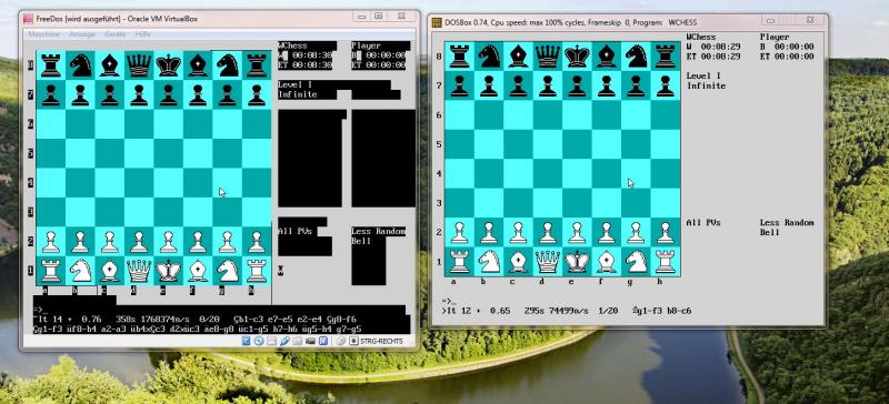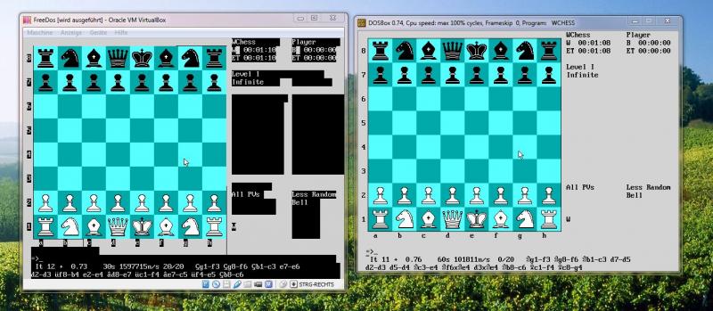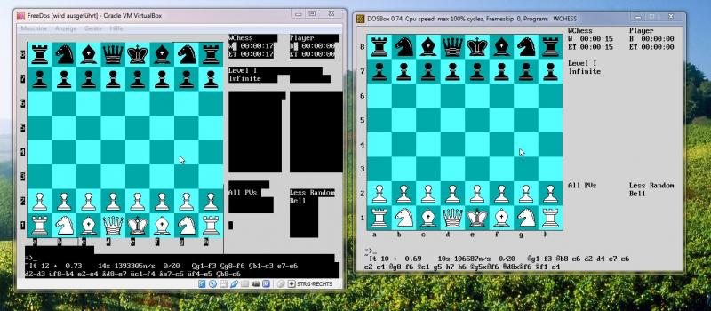 Ich habe jetzt FreeDos (VM VirtualBox) und Dosbox 0.74 nebeneinander laufen lassen . Screenshot nach einigen Sekunden , 1 Minute und nach 8 Minuten . Die Uhren laufen beide Synchron abzüglich ~2 Sekunden die ich brauchte um zu wechseln bzw.auf Go zu drücken. Ich weiß nicht wie ihr das seht , aber für mich sind das reale n/s bei FreeDos. Er kommt auch viel tiefer in den Suchbaum. Viele Grüße Mark 1 Wenn ich Wolfgang2 richtig verstanden habe, kann "das" nicht stimmen und müssen deshalb die unter FreeDos (Virtual Box) bei dir angezeigten n/s wohl kaum der Realität entsprechen. Das wären ja unglaubliche Differenzen in der Leistung. Mal sehen, was Wolgang2 dazu meint. Gruss Kurt |